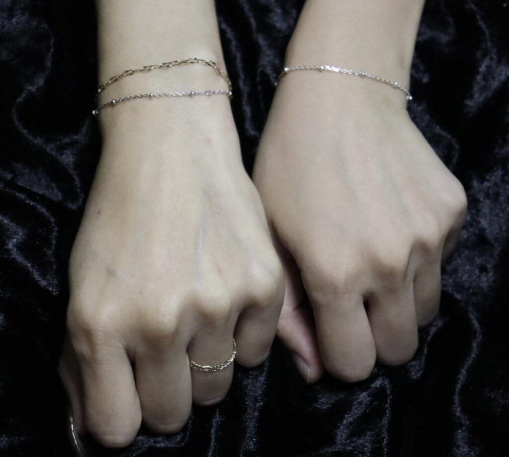 肌に溶け込む繊細なチェーンは、外れることなく共に時を刻み輝き続けます。
